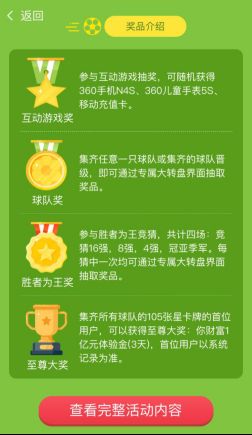 360手機助手推出的此次世界杯星卡牌活動,不僅有多種集卡方式,更為參與的用戶設置了多重獎勵。據說參與互動游戲的用戶通過抽獎,可隨機獲得360手機N4S、360兒童手表5S、移動充值卡;集齊一只球隊的用戶,還可通過專屬大轉盤界面抽取獎品,隨機獲得兒童手表5S+360手機Q5plus等獎品;參與勝者為王競猜16強,8強,4強以及冠亞季軍,每猜中一次均可通過專屬大轉盤界面抽取獎品一次,可相應獲得圣彼得堡雙人游、Macbook pro、beats耳機、360IOT組合等;集齊所有球隊的105張星卡牌的首位用戶,便可以獲得本次活動的至尊大獎:360你財富1億元體驗金,可以在360你財富的賬戶里體驗3天,總收益高達30000多元,還是很值得一試的。