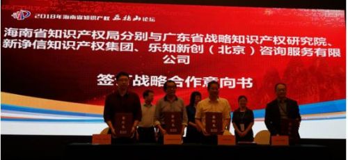 海南省知識產權局局長朱東海(前排右2)與樂知新創CEO高非(前排左1)簽署戰略合作意向書