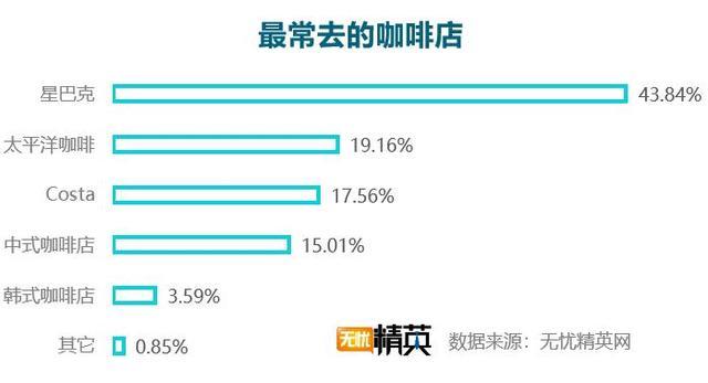 在職場精英們常去的咖啡店中,星巴克以絕對優勢排在第一位,有43.84%的人最常去的咖啡店是星巴克,其次是太平洋咖啡以及Costa咖啡。