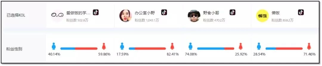從TOP4美食類KOL的粉絲數據上看,其粉絲質量,粉絲增量還是有比較好的表現,其中,尤以“野食小哥”的粉絲互動積極性、忠誠度高,視頻評贊比高達13.4:1,這得益于野食小哥親民化的人設和不拘一格的內容產出,相比于其他美食類KOL習慣于將食物的制作過程和制作完成的美好畫面展示出來,野食小哥自帶“節奏感”的吃相、個性化的美食制作場景,以及偶爾“皮一下”的性格,或許是讓他作為一個美食賬號,受到74.08%男性粉絲喜愛的原因,而對比其他3個美食類KOL,女性粉絲都有絕對占比優勢。