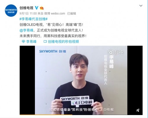 9月1日,中國電視第一品牌創維發出“大招”,創維電視官方微博發布消息,“國民男神”李易峰成為 “創維電視全球代言人”。