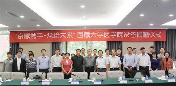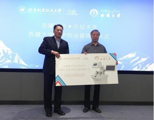 捐贈方代表虛擬現(xiàn)實/增強現(xiàn)實技術及應用國家工程實驗室主任趙沁平院士(右)和受贈方代表西藏大學醫(yī)學院書記扎堆先生(左)