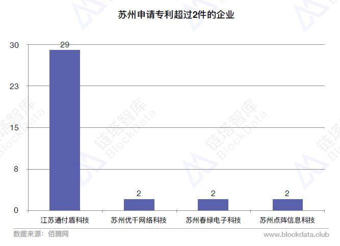 截止到2018年9月,蘇州申請區塊鏈專利43件,絕大部分都是江蘇通付盾公司申請的,占67%。申請數量超過2件的企業有四家,分別為江蘇通付盾科技有限公司(29件)、蘇州優千網絡科技有限公司(2件)、蘇州春綠電子科技有限公司(2件)、蘇州點陣信息科技有限公司(2件)。