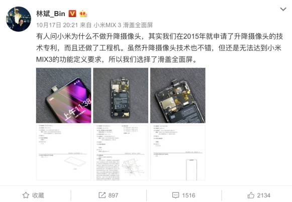 而在昨晚的時候,林斌微博上直接解開謎題。談到在2015年的時候小米就申請了升降攝像頭的技術專利,并且還做出了工程機。之所以最后沒用升降攝像頭方案,主要是無法達到小米MIX3的功能定義要求。所以才選擇了滑蓋全面屏。