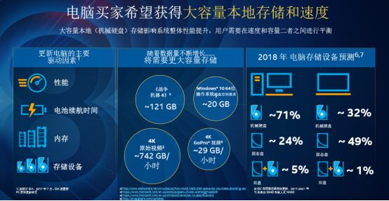 那么目前用戶所使用的硬盤是一個(gè)什么狀況呢?相關(guān)的市場調(diào)研數(shù)據(jù)顯示,臺(tái)式機(jī)有71%的用戶采用機(jī)械硬盤,24%采用固態(tài)硬盤 ,5%用的是機(jī)械+固態(tài)硬盤的組合。筆記本用戶有32%用的是機(jī)械硬盤,49%用的是固態(tài)硬盤,機(jī)械+固態(tài)的組合僅有1%。