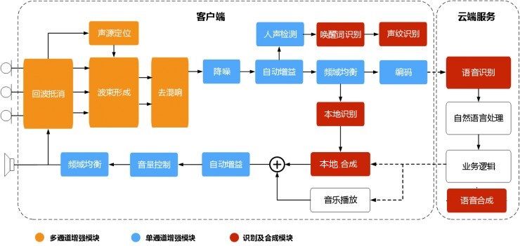 智能語音產品從人到機器完成一次語音交互,需要經過四個主要的技術環節:語音前端處理、語音識別(ASR)、自然語言理解(NLP)以及語音合成(TTS),即從聲音的拾取到轉換成文字,到理解其含義并作出反饋,再到將反饋說出。其中語音前端處理屬于客戶端,后三者則為云端。經過多年的技術積累,語音識別和語音合成已經獲得突破,基本可以滿足商用。而語音前端處理和自然語言理解依然是語音交互的核心瓶頸。