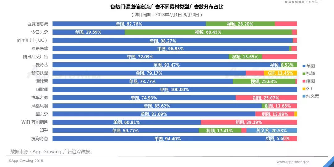 白皮書指出,在手游投放的廣告形式方面,各主流移動廣告平臺整體仍然以信息流廣告為主。百度信息流/阿里匯川(UC)/愛奇藝/新浪扶翼/bilibili/汽車之家/鳳凰鳳羽/趣頭條八大廣告平臺,信息流廣告占比均超過90%。而相對其他平臺而言,手游廣告主在一點資訊平臺更多投放橫幅廣告,廣告數占比高65.75%。