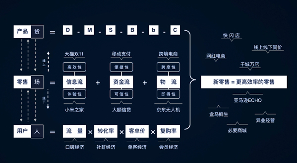 零售狹義的講就是最終端的銷售和用戶的關系。一個商品從生產到用戶手里,要經歷產業鏈的六個環節,D設計→M制造→S供應鏈→B大型商場/超市→b小型便利店→C客戶。溯源產業鏈,提高效率,才有機會提高零售的效益。關于“貨”的維度變革,劉潤提出了 “短路經濟”的概念,他表示,所有代表新零售的商業模式,都是在供應鏈上在做創新,短路經濟就是要去掉產業鏈更多中間環節,人與貨不必再商場相見,效率更高。