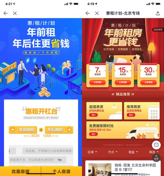 為了更好平衡“年前租房”與“年后租房”兩者利弊,貝殼租房聯合全國22個城市的品牌公寓,還特地推出了農歷年前的“惠租計劃”。