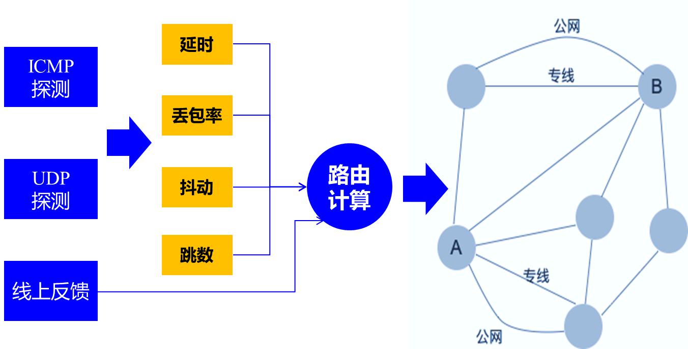 智能路由。 首先我們會通過兩個手段來獲取鏈路的基礎質量數據:第一個是通過ICMP和UDP探測拿到鏈路延時、丟包率、歷史抖動、鏈路跳數等;第二個是線上實際傳輸質量的反饋。之后,再通過這些基礎數據加權去計算每條路徑的質量,依次選擇最優和次優路徑。路由計算可以針對網頁、圖片、視頻等不同的傳輸場景來調整策略,比如網頁加速對延時更關注,而視頻加速則需要穩定的傳輸帶寬,可以在路由計算中分別啟用延時優先和丟包率優先的策略來適應這兩種業務場景。路由系統會每分鐘重新計算和刷新路由,以實現網絡鏈路質量的變化。