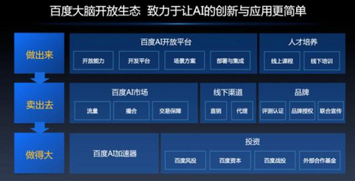 先來看5月29日的百度大腦生態合作計劃及AI市場發布會,百度首次提出“做出來”、“賣出去”、“做得大”三步進階的生態架構,其中: