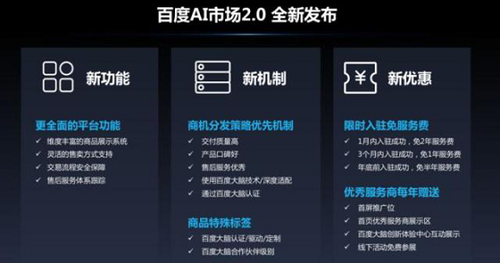 以及“百度AI市場2.0”,將AI落地相關的企業和產品匯聚到同一個平臺上來,構建起生態鏈合作的完整機制,并通過推出新功能、新機制、新優惠等,幫助每一家優秀的AI創新企業獲得成功。