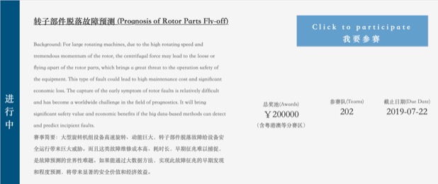 在2019大數據產業峰會我們發布了首道主賽區賽題——由沈陽鼓風機集團測控技術有限公司提供的“大型旋轉機組轉子部件脫落故障預測”,這也將會是一場真正意義上的全球競技,中國信息通信研究院作為全球工業大數據領域頂尖活動——PHM亞太學術論壇(www.phmap.cn)主辦方之一,本道賽題將有全球參賽選手和你同臺PK。