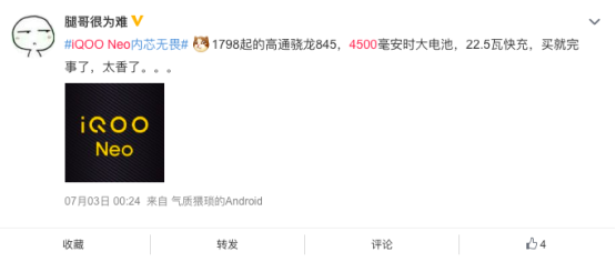 與前代的iQOO一樣,秉承著“生而強悍”的理念,雖然這次的iQOO Neo雖然定位千元起步,但在外觀設計、性能配置以及續航上,都有著非常出色的表現。也正因如此,剛發布就引起微博不少熱議,紛紛表示“真香”。
