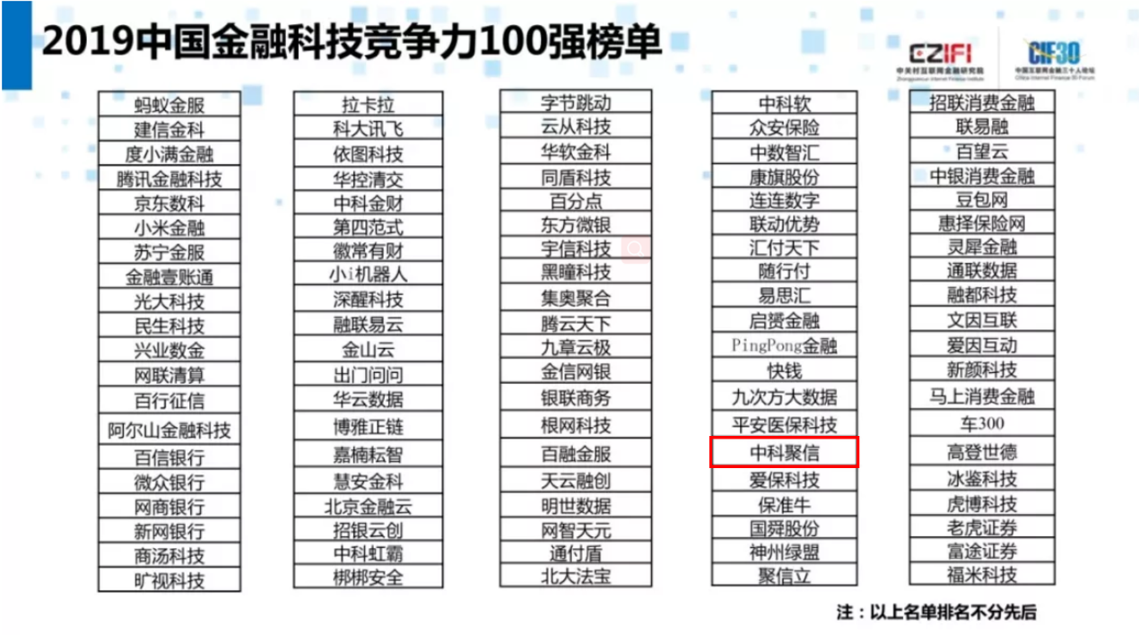 (2019年7月5日,中國(guó)北京)近日,由中關(guān)村互聯(lián)網(wǎng)金融研究院、中國(guó)互聯(lián)網(wǎng)金融三十人論壇(CIF30)、國(guó)培機(jī)構(gòu)聯(lián)合主辦的第三屆金融科技與金融安全峰會(huì)在北京銀行保險(xiǎn)產(chǎn)業(yè)園成功舉辦。在本屆峰會(huì)上,中關(guān)村互聯(lián)網(wǎng)金融研究院隆重發(fā)布了《2019中國(guó)金融科技競(jìng)爭(zhēng)力100強(qiáng)榜單》(下簡(jiǎn)稱“百?gòu)?qiáng)榜單”)。而作為中國(guó)金融大數(shù)據(jù)挖掘與分析領(lǐng)域的佼佼者,中科聚信(下簡(jiǎn)稱“SCAI”)憑借在金融科技行業(yè)多年沉淀的行業(yè)經(jīng)驗(yàn)及技術(shù)底蘊(yùn)成功入圍,更得到相關(guān)業(yè)界專家的首肯與高度評(píng)價(jià)。