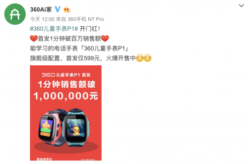 7月16日,360兒童手表P1正式開售,售價為599元。剛開售1分鐘,便取得了各大平臺累積銷售額超過一百萬的優(yōu)秀成績。取得該優(yōu)異成績并不是沒理由。