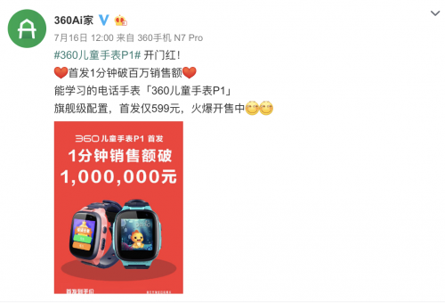 在360兒童手表P1開售之后僅僅過去1分鐘的時間,便取得了各大平臺累積銷售額超過一百萬的優秀成績,取得該優異成績并不是沒理由的。