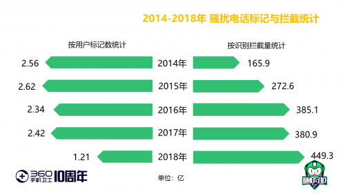 面臨各類移動(dòng)威脅的挑戰(zhàn),不僅政府相關(guān)部門和運(yùn)營商的管控力度隨之增加,并且以360為代表的國內(nèi)安全廠商的安全技術(shù)也不斷實(shí)現(xiàn)“井噴式”發(fā)展,對中國移動(dòng)安全發(fā)展的助推作用愈加凸顯。從數(shù)據(jù)情況來看,Android端惡意程序在經(jīng)過2012-2015年的高速增長期后,感染量正逐年穩(wěn)步下降,2018年感染量僅為1.06億人次,Android木馬在2014年爆發(fā)后也歸于平靜。同時(shí),隨著被標(biāo)記騷擾電話數(shù)量的累積,360手機(jī)衛(wèi)士等移動(dòng)端安全軟件的識(shí)別攔截量逐年增多,2018年用戶所標(biāo)記的騷擾電話數(shù)量已由2.56億下降至1.21億。