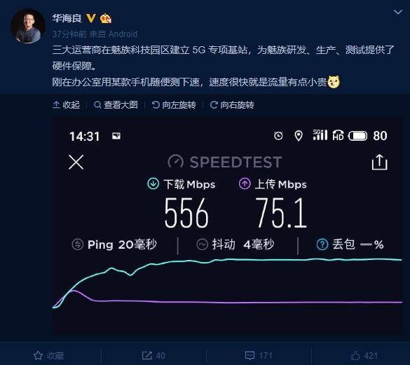 昨天下午,魅族科技副總裁華海良曝光了“某款手機”的5G測速截圖,圖片顯示魅族首款5G手機的下載峰值速率達到556 Mbps,最高上傳速度75.1 Mbps。根據此前信息,這款手機應為魅族將于2020年春季推出的魅族17。