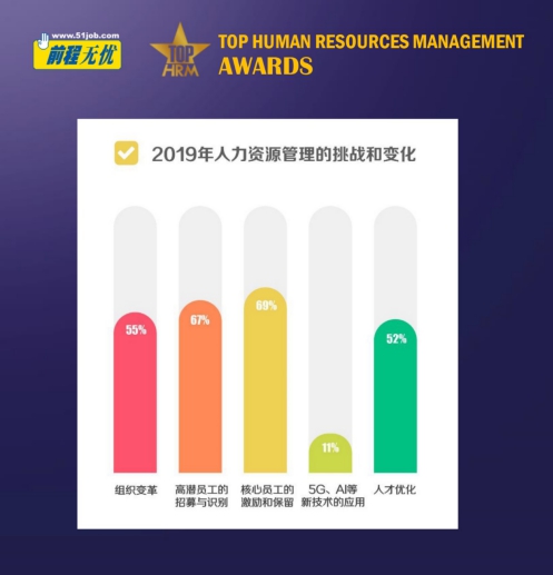 核心員工的激勵和保留、高潛員工的招募與識別,成了2019年人力資源管理的挑戰,其次是組織變革和人才優化,有11.4%的企業身先士卒,將5G、AI等新技術運用到人力資源管理中,主要集中在互聯網、通信、教育等行業。