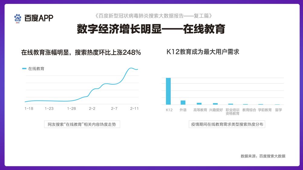 比如在線教育的百度搜索大數據在今年春節后不久就開始猛漲,這比在線教育概念股的瘋漲足足提前了兩個禮拜左右。可以給出的合理解釋是:1月23日武漢封城的消息曝出后,一些家長就開始焦慮孩子開學的問題,在線教育相關關鍵詞的搜索量開始迅速增長。