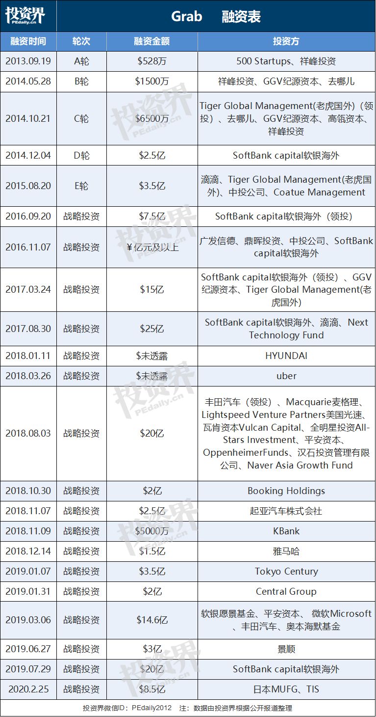 事實上,在軟銀和滴滴入場之后,Grab才實現了融資額度上的飛躍。2014年10月,Grab獲得軟銀獨家投資2.5億美元,此后,軟銀幾乎參與了Grab的每一輪大額投資,并逐步加碼。