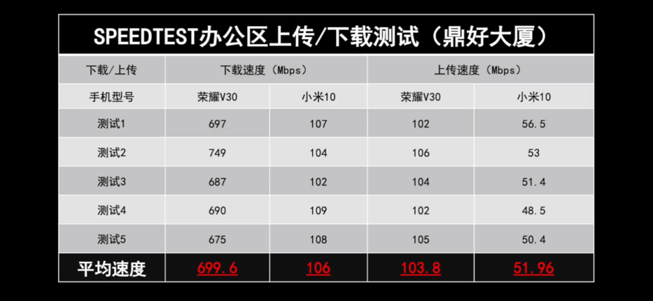隨后測(cè)試人員進(jìn)行辦公區(qū)域的室內(nèi)測(cè)試,使用Speedtest上傳和下載測(cè)試,可以看到在室內(nèi)下載速度上,榮耀V30的下載速度比戶外的優(yōu)勢(shì)還要突出。進(jìn)行了5組測(cè)試,平均速度高達(dá)600Mbps,而小米10則是106Mbps,連榮耀V30的一半都達(dá)不到。