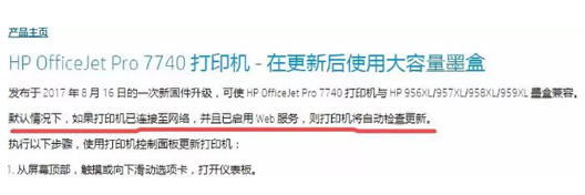 可好景不長,在2019年4月12日左右,惠普強制對約翰的7740打印機進行了固件升級,從那天起,約翰的7740打印機就無法再使用第三方墨盒或者再灌墨墨盒。如果使用,7740打印機立即顯示錯誤信息;只有使用惠普原裝墨盒,7740打印機才能正常工作。