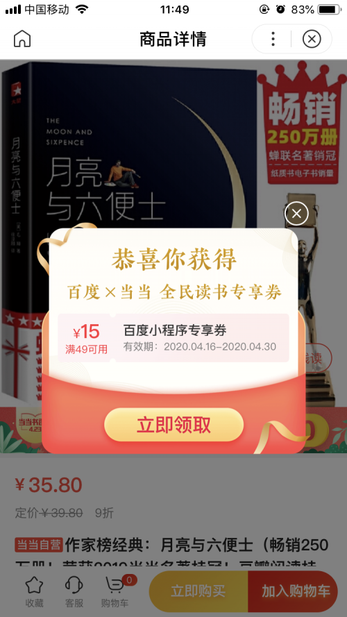 最典型的表現就是,百度已經支持全場景賣書了。作為百度內部電商平臺的角色,智能小程序的購物功能已經延伸到了“全民讀書月”的各個場景中。