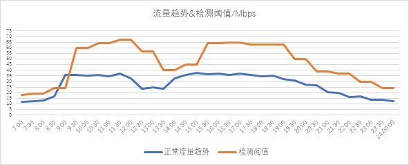 常見的流量自學習功能普遍將用戶的所有應用視為一個整體防護對象,根據一天中整個防護對象的流量趨勢篩選出峰值流量進行自學習計算。下圖為某傳統的檢測設備通過該算法得到的某用戶業務整體流量趨勢和相應檢測閾值: