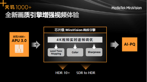 基于獨立AI處理器APU3.0的強勁AI算力,MediaTek天璣1000+通過AI場景畫質優化,把4K 視頻的每一幀畫面對比度、銳利度和色彩都調整到最適宜的程度。而且MiraVision讓原生4K HDR10+視頻畫質和色彩更逼真。同時,MiraVision支持視頻 HDR 增強技術,能實時增強視頻畫面的HDR高動態范圍效果,讓暗處細節更清晰,高光更柔和。