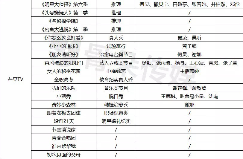 待播新綜藝中,《聽什么歌都像唱自己》《聲計劃》《我想和你唱》《巧手神探》《熱鬧少年》《運動吧少年》等多檔新綜藝,都是芒果臺今年注重推出的“市場新類型”,前三檔基本都與音樂有關,每檔節目中都有市場當紅偶像坐鎮,譬如《聽什么歌都像唱自己》中邀請來的楊冪、楊紫、王俊凱等,《聲計劃》中的吳亦凡、趙麗穎,以及《我想和你唱》中的陳坤、胡歌等。