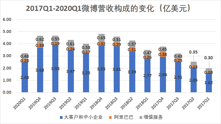 財報顯示,一季度微博營收3.234億美元,同比下降19%;凈利潤5210.8萬美元,同比下滑65.4%。從收入來源看,來自大客戶(KA)和中小企業(yè)(SME)的廣告及營銷收入為2.479億美元,同比下降24%;來自阿里巴巴的廣告收入為2756.7萬美元,同比增加65.7%;微博的增值服務(wù)收入為4800萬美元,同比減少17%。