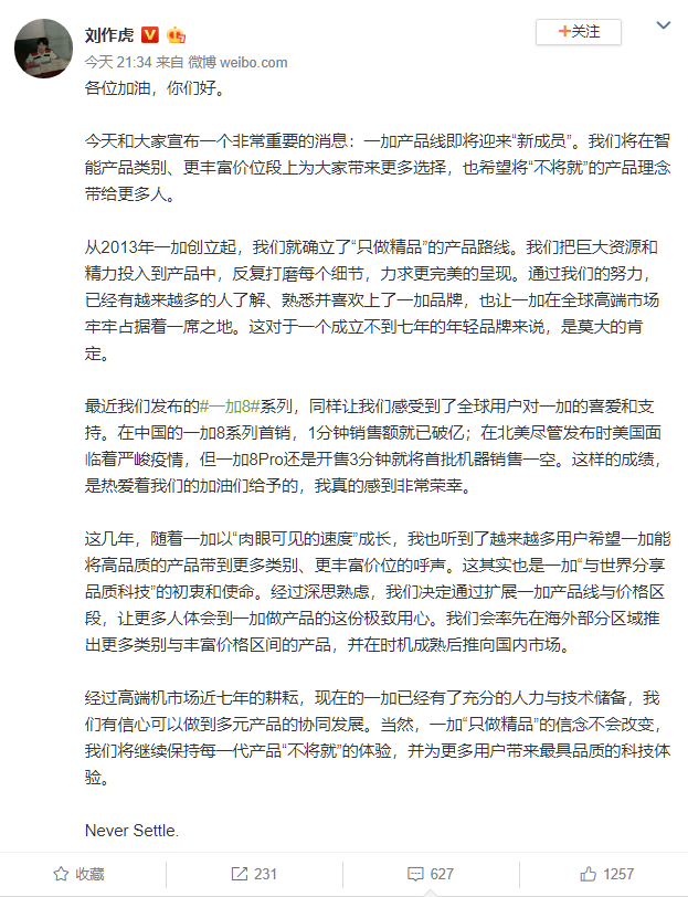 5月27日晚,一加CEO兼創(chuàng)始人劉作虎通過(guò)微博宣布,未來(lái)一加將會(huì)擴(kuò)充新的產(chǎn)品線,同時(shí)推出更多不同價(jià)位段的產(chǎn)品。