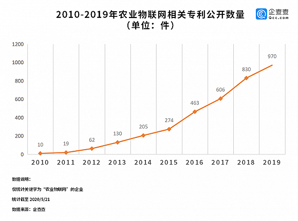物聯網不是科技狂想,而是又一場科技革命。農業物聯網的建設包括環境、植物信息檢測,溫室、農業大棚信息檢測和標準化生產監控登,例如農作物生長情況、病蟲害情況、土地灌溉情況、土壤空氣變更等環境狀況。企查查數據顯示,目前農業物聯網相關的專利公開數量達1448 件,近年來專利數量逐步遞增,2019年公開的專利數量為970件。