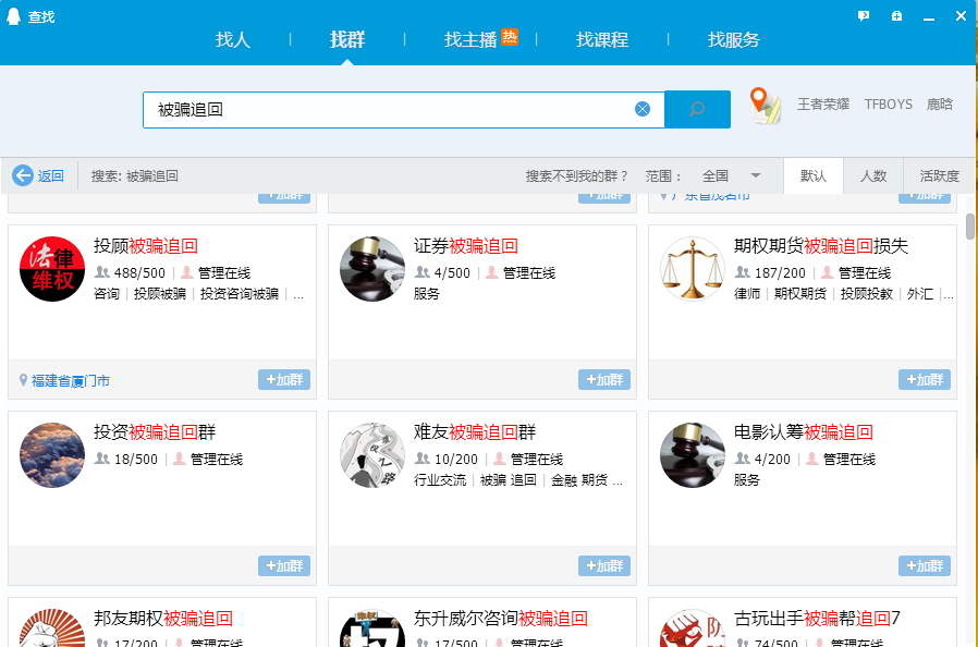 這類騙局長期活躍于貼吧、QQ群、微博、山寨舉報網,詐騙團伙以追損律師或者受害人的名義,宣傳其強大的追損實力,以精準鎖定受害者因為什么被騙,從而提前準備好話術,進行全面撒網,重點捕撈。
