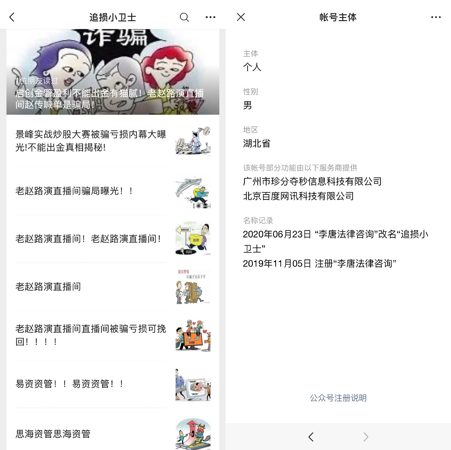 比如,當我們打開鏈接微信上追損的文章,可以看到的是很多在做追損服務的賬號在以受害人和律師的身份控訴那個冒牌的錦鯉財經,最后還不忘附上他們的聯系方式,美其名曰幫忙追損。