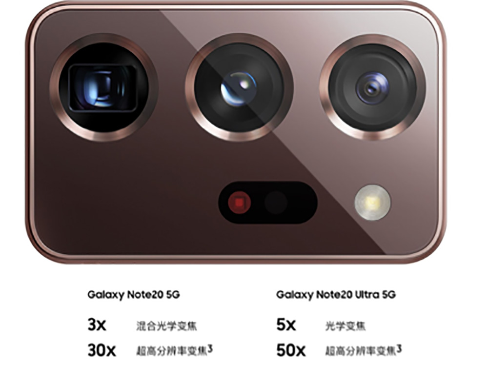 三星Galaxy Note20系列均采用了前置1000萬像素自拍鏡頭,后置三攝的設(shè)計。其中三星Galaxy Note 20后置的是1200萬像素主攝+1200萬像素超廣角鏡頭+6400萬像素長焦鏡頭,支持3x混合光學(xué)變焦、30x超視覺空間變焦。三星Galaxy Note 20 Ultra后置的是1.08億像素主攝(F1.8)+1200萬像素廣角鏡頭(F2.2)+1200萬像素長焦鏡頭(F3.0),外加極光對焦傳感器,支持5x光學(xué)變焦、50x超視覺空間變焦、OIS光學(xué)防抖。
