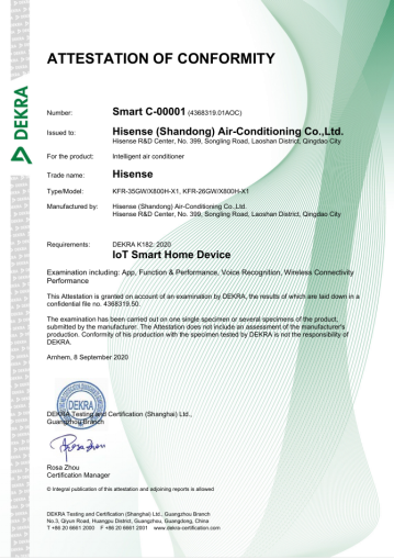 9月9日,全球知名第三方專業(yè)檢測認證機構(gòu)DEKRA德凱在2020安全智慧城市展覽會舉辦了全球首張Smart Home認證證書頒證儀式。海信健康家X8新風空調(diào)榮獲智能空調(diào)K182標準001號證書,海信也成為全球首家通過該認證的空調(diào)品牌。