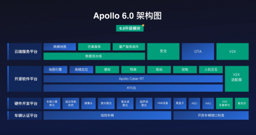 全新升級的6.0版本,包括智能新模型,安全無人化,系統新升級,聯動新服務,V2X車路協同五大功能,車輛認證平臺、硬件開發平臺、開源軟件平臺和云端服務平臺都有很多升級,不僅有新的硬件,軟件上也推出基于深度學習的新算法,新增了無人化接口。此外,Apollo 6.0版本還對云服務進行了全面升級,能更好的幫助開發者運用平臺能力。
