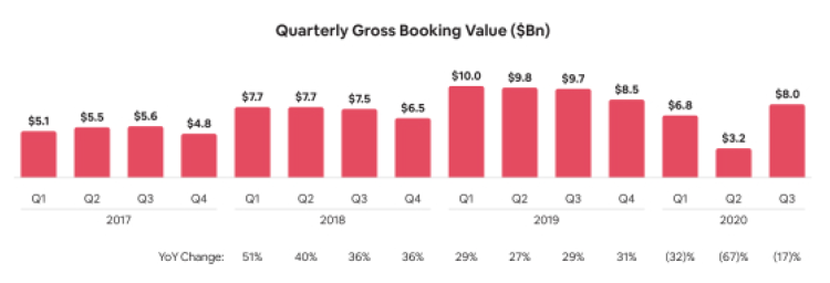 GBV(Gross Booking Value,預(yù)訂總額)也是衡量酒店民宿類(lèi)公司的重要指標(biāo),與電商行業(yè)較為關(guān)注的GMV(成交總額)相類(lèi)似。2020年前9個(gè)月,Airbnb的累計(jì)GBV為180億美元,較去年同期的294億美元下降39%。其中第二季度下降最為嚴(yán)重,GBV下降率達(dá)到67%。隨后由于旅行需求的反彈,該公司在2020年第三季度實(shí)現(xiàn)了GBV的增長(zhǎng),但仍較去年同期下降了17%。
