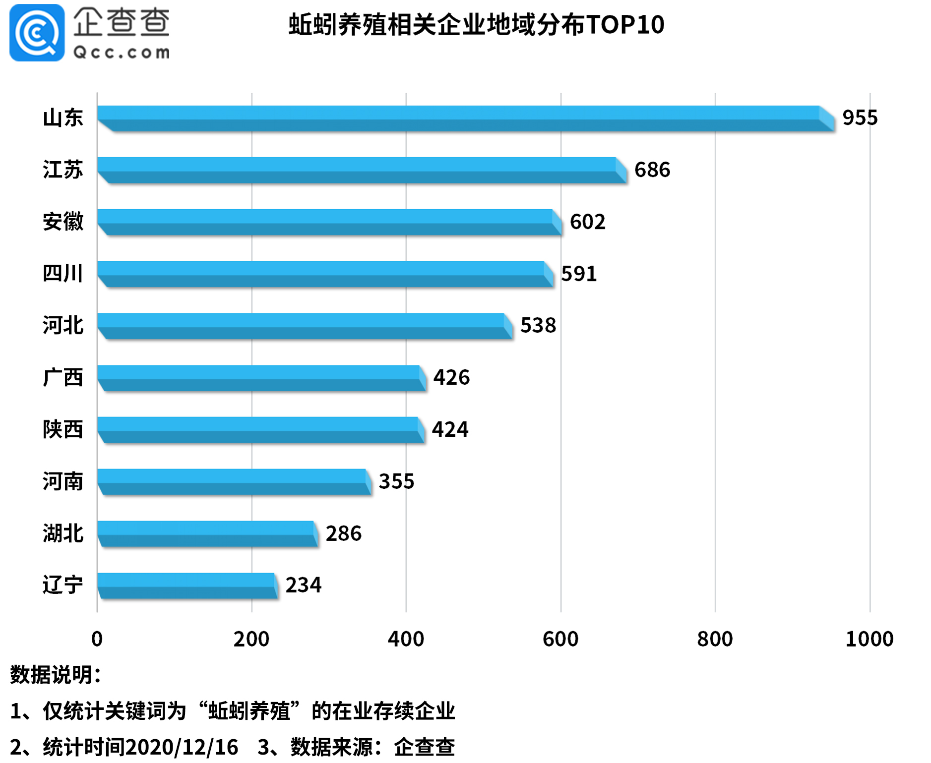 企查查數據顯示,山東擁有的蚯蚓養殖相關企業數量最多,達955家,遙遙領先于其他各省。江蘇、安徽、四川以及河北,分別以686家、602家、591家和538家位列前5。