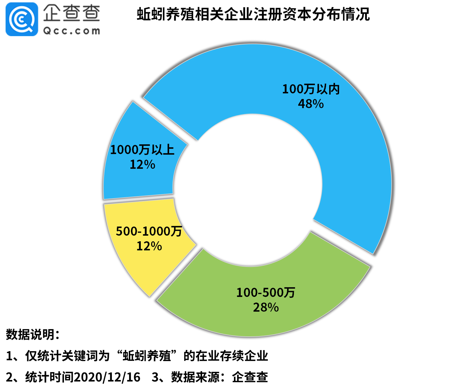 從注冊資本上看,企查查數據顯示,我國超7成的蚯蚓養殖相關企業注冊資本在500萬以內,其中48%的企業注冊資本在100萬以內,28%的企業注冊資本在100-500萬這個區間,注冊資本在1000萬以上的,則占總量的12%。