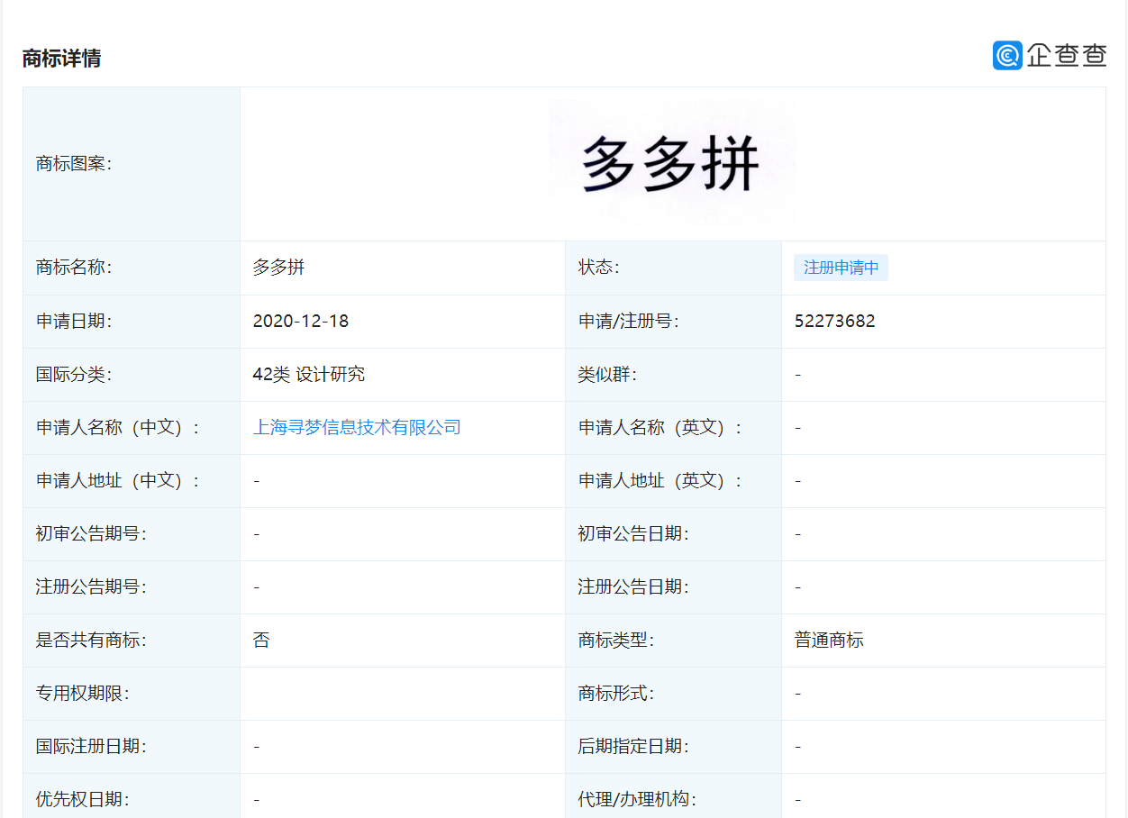 企查查APP顯示,近日,拼多多關(guān)聯(lián)公司上海尋夢(mèng)信息技術(shù)有限公司新增“多多拼”商標(biāo)申請(qǐng)信息,國(guó)際分類包括42類“設(shè)計(jì)研究”和36類“金融物管”,商標(biāo)狀態(tài)均為“注冊(cè)申請(qǐng)中”。