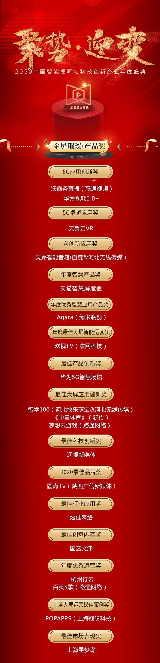 產品類獎項方面,共頒發15個獎項。其中,聯通視頻科技有限公司的“沃商務直播”、華為技術有限公司的“華為視頻3.0+”共同榮獲5G應用創新獎,號百控股股份有限公司的“天翼云VR”榮獲5G卓越應用獎,北京百度網訊科技有限公司與河北廣電無線傳媒股份有限公司聯合申報的“靈犀智能音箱”榮獲AI創新應用獎,阿里文娛集團優酷OTT事業部的“天貓智慧屏魔盒”榮獲年度智慧產品獎,深圳綠米聯創科技有限公司 的Aqara榮獲年度優秀智慧應用產品獎,廣州歡網科技有限責任公司的“歡視TV”榮獲年度最佳大屏智能運營獎,華為技術有限公司的“華為5G智慧場館”榮獲最佳產品創新獎,河北快樂萌寶教育科技有限公司與河北廣電無線傳媒股份有限公司聯合申報的“智學100”、新傳在線(北京)信息技術有限公司的“中國體育”、深圳市路通網絡技術有限公司的“夢想云游戲”共同榮獲最佳大屏應用創新獎,遼視新媒體發展有限公司的“遼視新媒體”榮獲最佳科技創新獎,陜西廣信新媒體有限責任公司的“圓點TV”榮獲2020最佳品牌獎,南京炫佳網絡科技有限公司的“炫佳網絡”榮獲最佳行業應用獎,國藝文津新媒體科技(北京)有限公司的“國藝文津”榮獲最佳創意內容獎,杭州行云信息科技有限公司的“杭州行云”、深圳市路通網絡技術有限公司的“百靈K歌”共同榮獲年度優秀運營獎,上海視盼網絡科技有限公司的“POPAPPS”榮獲年度大屏運營最佳案例獎,上海星夢島網絡科技有限公司的“上海星夢島”榮獲最佳市場表現獎。