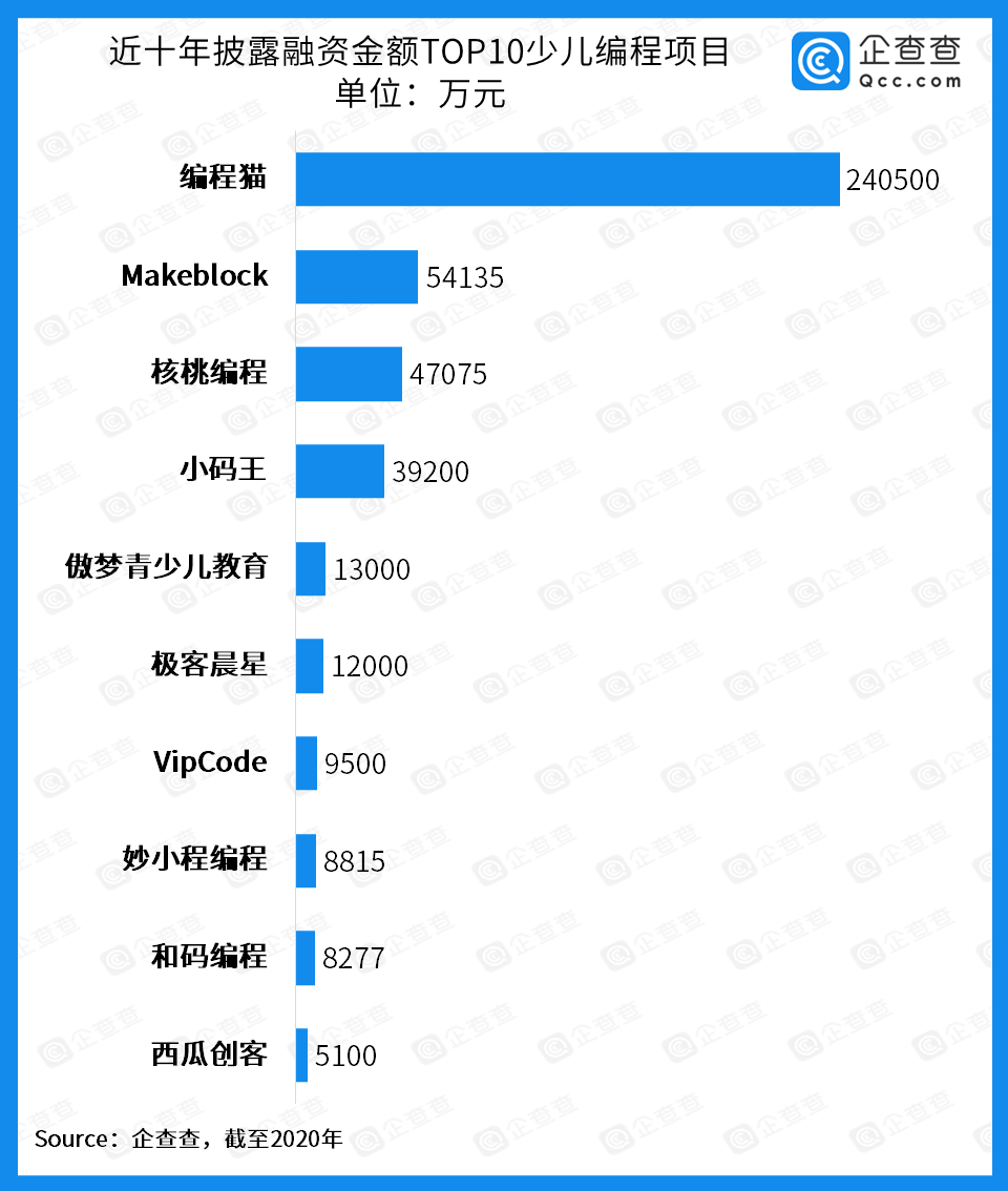 企查查數據顯示,“編程貓”以24億元的披露總金額位列少兒編程賽道的第一,排名第二三的分別是“童心制物(Makeblock)”、“核桃編程”,披露總金額分別是5.4億元、4.7億元。