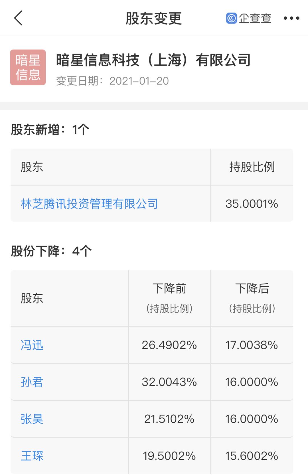 企查查App顯示,近日暗星信息科技(上海)有限公司(下稱“暗星科技”)發生工商變更,新增投資人林芝騰訊投資管理有限公司;同時該公司注冊資本由約111萬元變更為約139萬元,增幅25%。