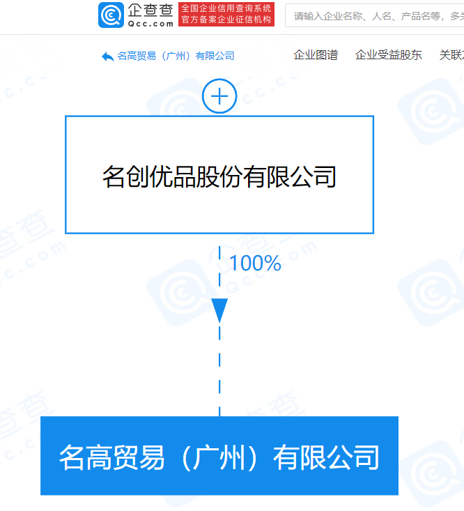 企查查APP顯示,名高貿易(廣州)有限公司成立,注冊資本3.4億元,法定代表人為周書,經營范圍含企業總部管理;以自有資金從事投資活動等。企查查股權穿透顯示,該公司由名創優品股份有限公司全資持股。