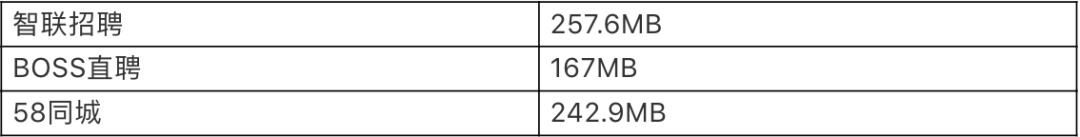 招聘領(lǐng)域中也出現(xiàn)了同樣的現(xiàn)象,對比幾款招聘類APP,增速最快的BOSS直聘也比其他同類APP小出100MB左右的內(nèi)存。