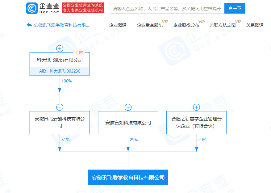 企查查App顯示,4月26日安徽訊飛愛學教育科技有限公司成立,法定代表人為王政,注冊資本3億元,經營范圍包含教育咨詢服務(不含涉許可審批的教育培訓活動);教育教學檢測和評價活動;第二類增值電信業務;出版物零售等。企查查股權穿透顯示,該公司由安徽訊飛云創科技有限公司(科大訊飛(002230)子公司)、安徽言知科技有限公司等共同持股。